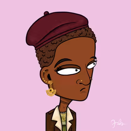 Collection Depressed Citizens Artist Juls Description ART. No team, no project, no future. Depressed Citizens is an urban & existential Art expression on Ordinals. In a parallel universe, "THEI" control us. DC unites against toxic society, encouraging critical thinking. 100% hand made collection that took Juls more than 6 months of daily work. Name Citizen#410 Origin African descendant Gender Woman Necklace Choker Hat Burgundy beret Mustache Beard No beard Glasses No Glasses Earrings Rook hoop Hair Style Short tight curls Clothes Granny geen elbow-sleeve shirt Tattoo No Tattoo Star Background Without stars